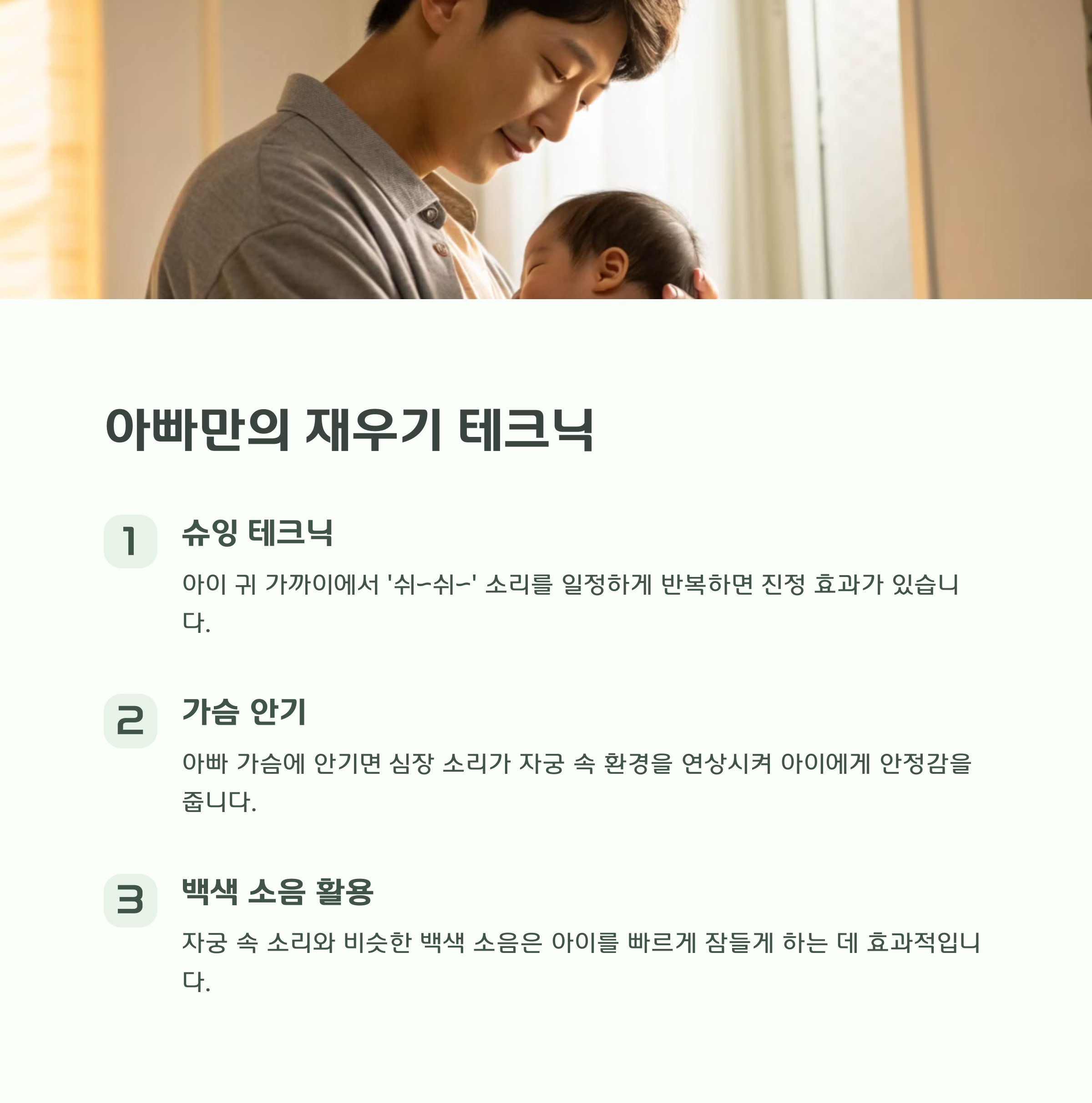 | 아빠 목소리 수면 유도 | 낮고 일정한 목소리로 노래나 동화 들려주기 | 아빠 목소리의 진동이 안정감 제공 |